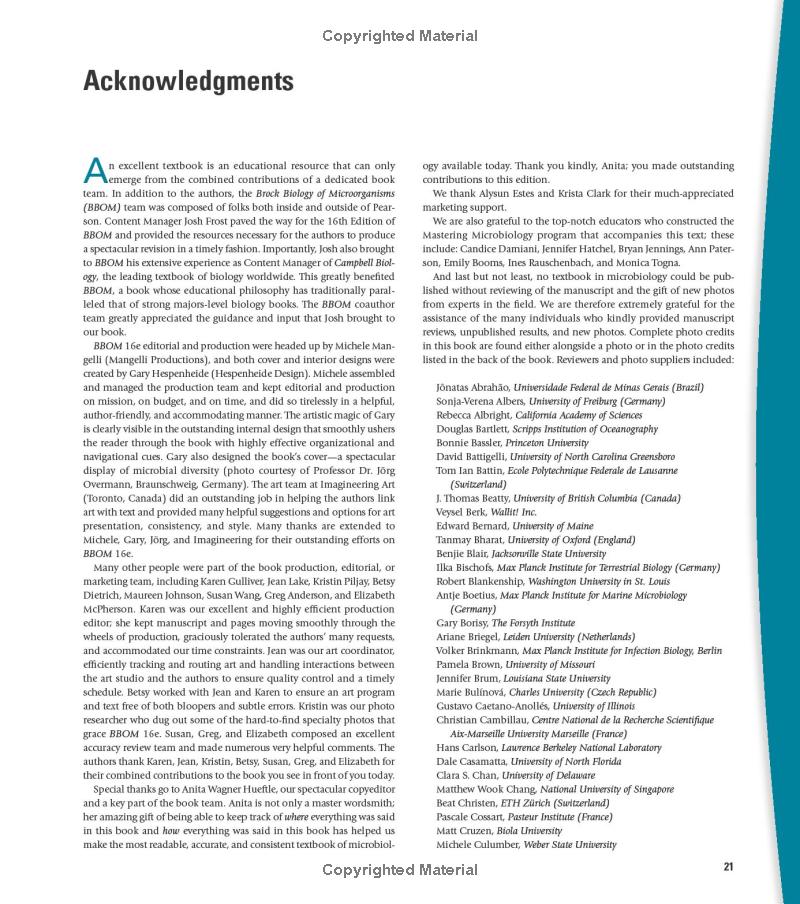 Brock Biology of Microorganisms setsthe standard for accuracy, impeccable scholarship, a visually stunning art program,and the use of cutting-edge research to illustrate basic concepts. The textguides students through the six major themes of microbiology ― Evolution, CellStructure and Function, Metabolic Pathways, Information Flow and Genetics,Microbial Systems, and the Impact of Microorganisms ― as outlined by theAmerican Society for Microbiology Conference on Undergraduate Education(ASMCUE). This robust and modern approach takes students through the genomicsrevolution and “omics” maze that has transformed microbiology and sharespowerful tools that microbiologists use to probe deeper and further into themicrobial world than ever before.