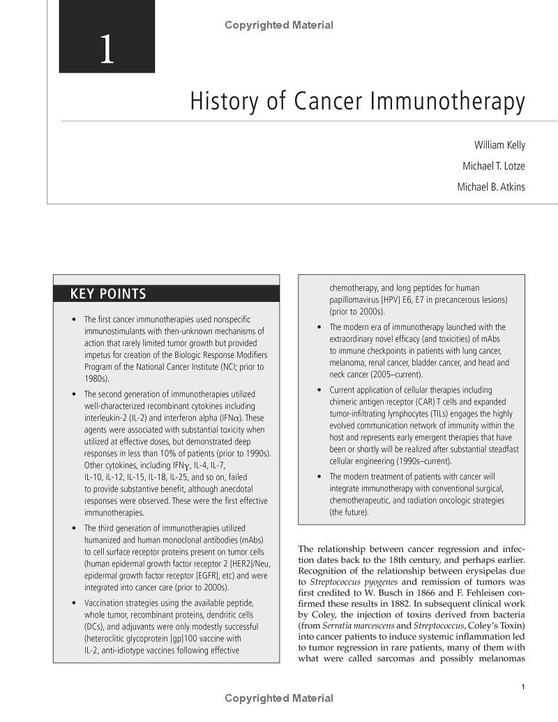 - Discusses clinical aspects of immunotherapy for individual cancer types, including melanoma and other skin cancers, lung cancers, gynecologic cancers, gastrointestinal cancers, hematologic cancers, genitourinary cancers, head and neck cancers, sarcomas, brain and other CNS cancers, breast cancer, and pediatric malignancies.