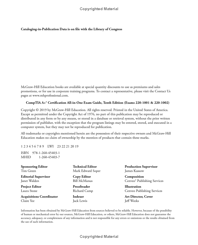 This fully revised and updated resource offers complete coverage of the latest release of CompTIA A+ exams 220-1001 & 220-1002. You’ll find learning objectives at the beginning of each chapter, exam tips, practice exam questions, and in-depth explanations. Designed to help you pass the CompTIA A+ exams with ease, this definitive guide also serves as an essential on-the-job IT reference.