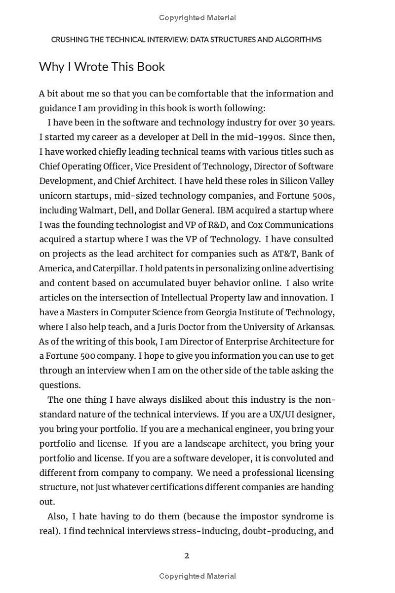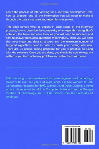 This book covers what to expect in each stage of the interview process, how to describe the complexity of an algorithm using Big-O notation, the basic software theories you will need to succeed, and how to answer behavioral questions meaningfully. Then you will learn the most important data structures and the minimum number of targeted algorithms need in order to crush your coding interview. There are 75 unique coding problems for you to practice on along with the solutions. Once you are done, you should be able to map the patterns you learn onto any problem and solve them with ease.