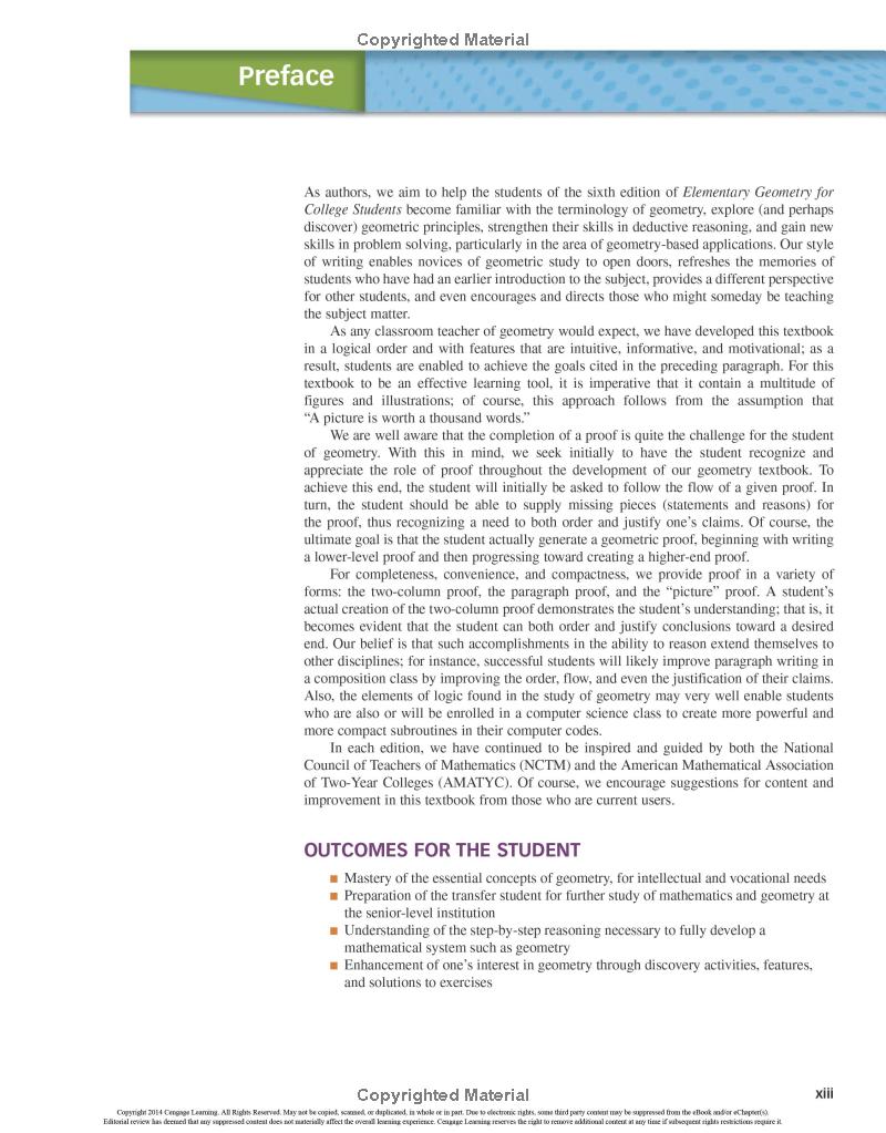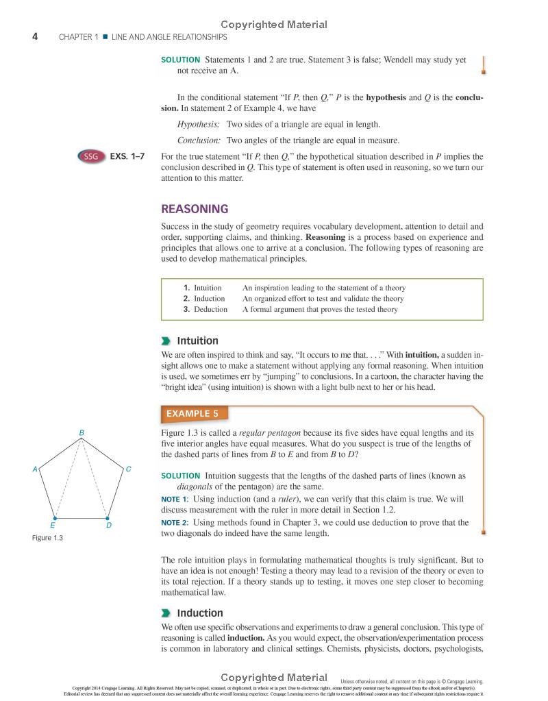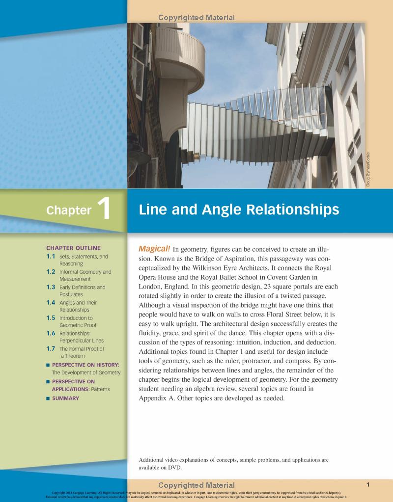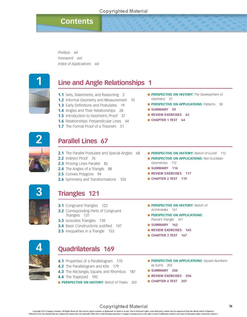 Building on the success of its first five editions, the Sixth Edition of the market-leading text explores the important principles and real-world applications of plane, coordinate, and solid geometry. Strongly influenced by both NCTM and AMATYC standards, the text includes intuitive, inductive, and deductive experiences in its explorations. Goals of the authors for the students include a comprehensive development of the vocabulary of geometry, an intuitive and inductive approach to development of principles, and the strengthening of deductive skills that leads to both verification of geometric theories and the solution of geometry-based real world applications. Updates in this edition include the addition of 150 new problems, new applications, new Discover! activities and examples and additional material on select topics such as parabolas and a Three-Dimensional Coordinate System.