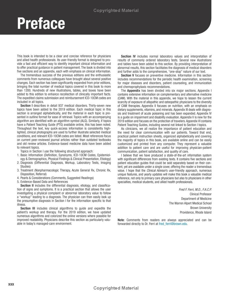 Ferri’s Clinical Advisor, in publication for over 20 years, is an established brand, and the current design works well and is recognized by customers. The 5-Books-in-One format sets Ferri’s apart and will be retained. Online extras (downloadable patient guides, in English and Spanish) remain important. The explanatory icons (mouse, PTG, ALG, EBM) will be retained.