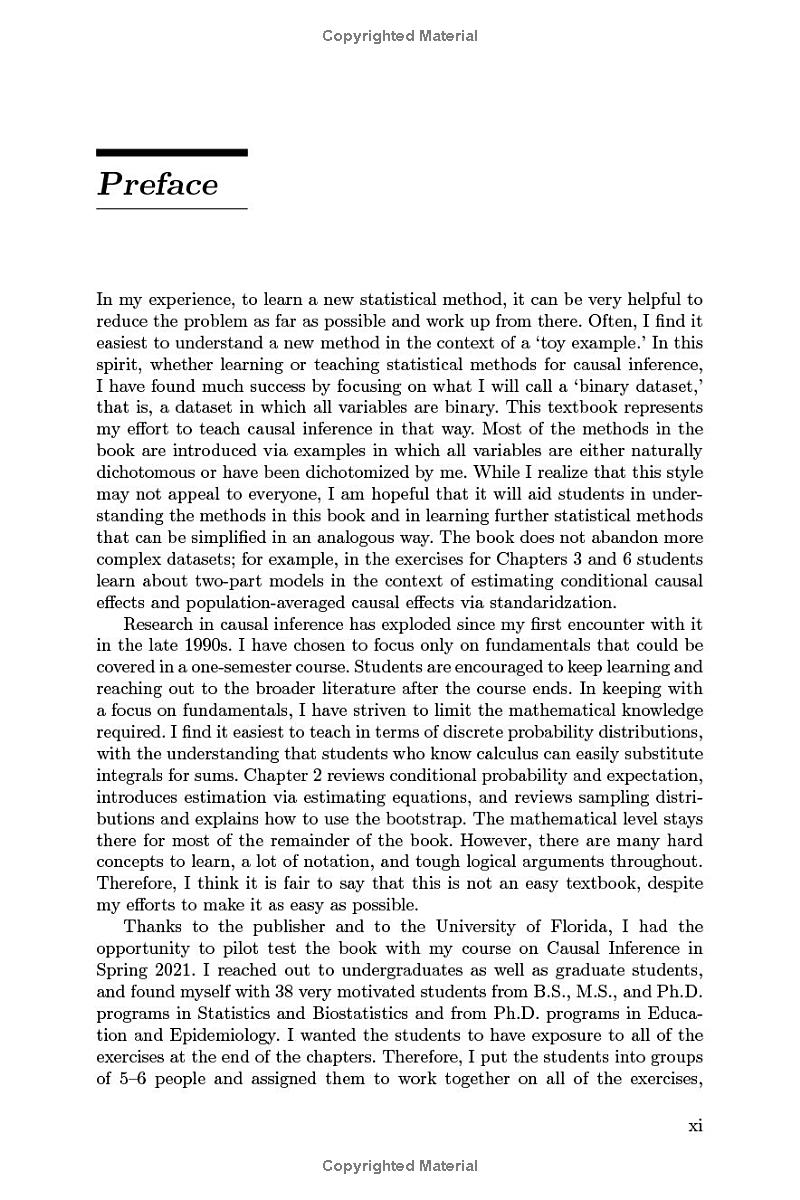 Beginning with a brief history and a review of essential elements of probability and statistics, a unique feature of the book is its focus on real and simulated datasets with all binary variables to reduce complex methods down to their fundamentals. Calculus is not required, but a willingness to tackle mathematical notation, difficult concepts, and intricate logical arguments is essential. While many real data examples are included, the book also features the Double What-If Study, based on simulated data with known causal mechanisms, in the belief that the methods are best understood in circumstances where they are known to either succeed or fail. Datasets, R code, and solutions to odd-numbered exercises are available on the book’s website at www.routledge.com/9780367705053. Instructors can also find slides based on the book, and a full solutions manual under ‘Instructor Resources’.