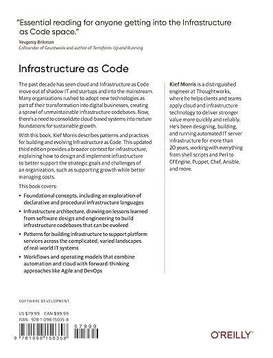 With this book, Kief Morris describes patterns and practices for building and evolving infrastructure as code. The third edition provides a broader context for infrastructure, explaining how to design and implement infrastructure to better support the strategic goals and challenges of an organization, such as supporting growth while better managing costs.