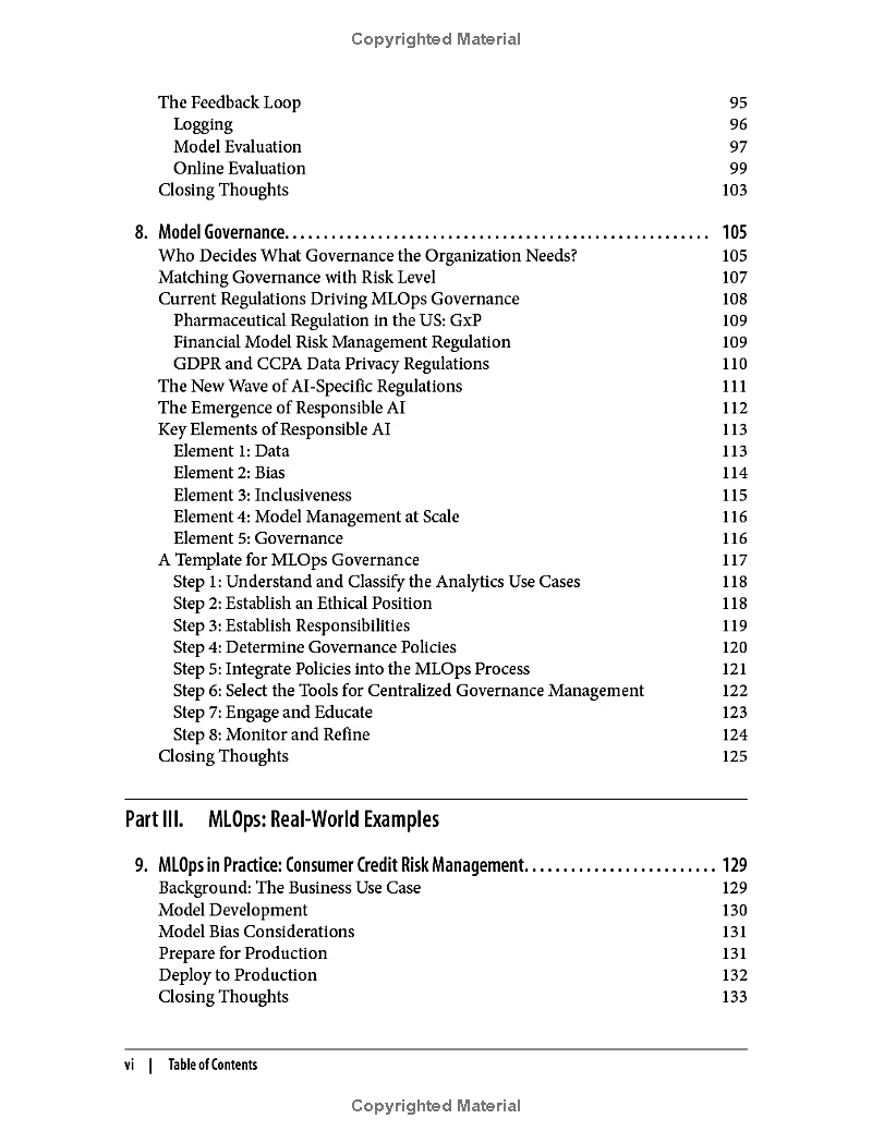 This book introduces the key concepts of MLOps to help data scientists and application engineers not only operationalize ML models to drive real business change but also maintain and improve those models over time. Through lessons based on numerous MLOps applications around the world, nine experts in machine learning provide insights into the five steps of the model life cycle–Build, Preproduction, Deployment, Monitoring, and Governance–uncovering how robust MLOps processes can be infused throughout.