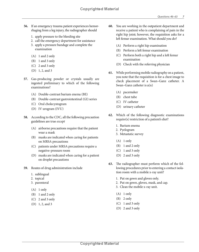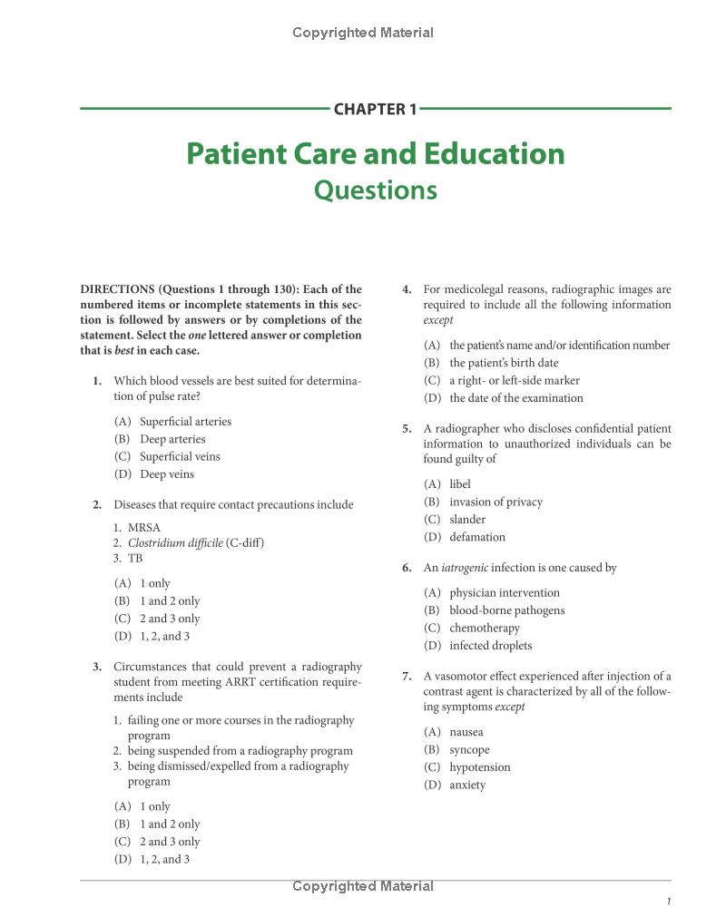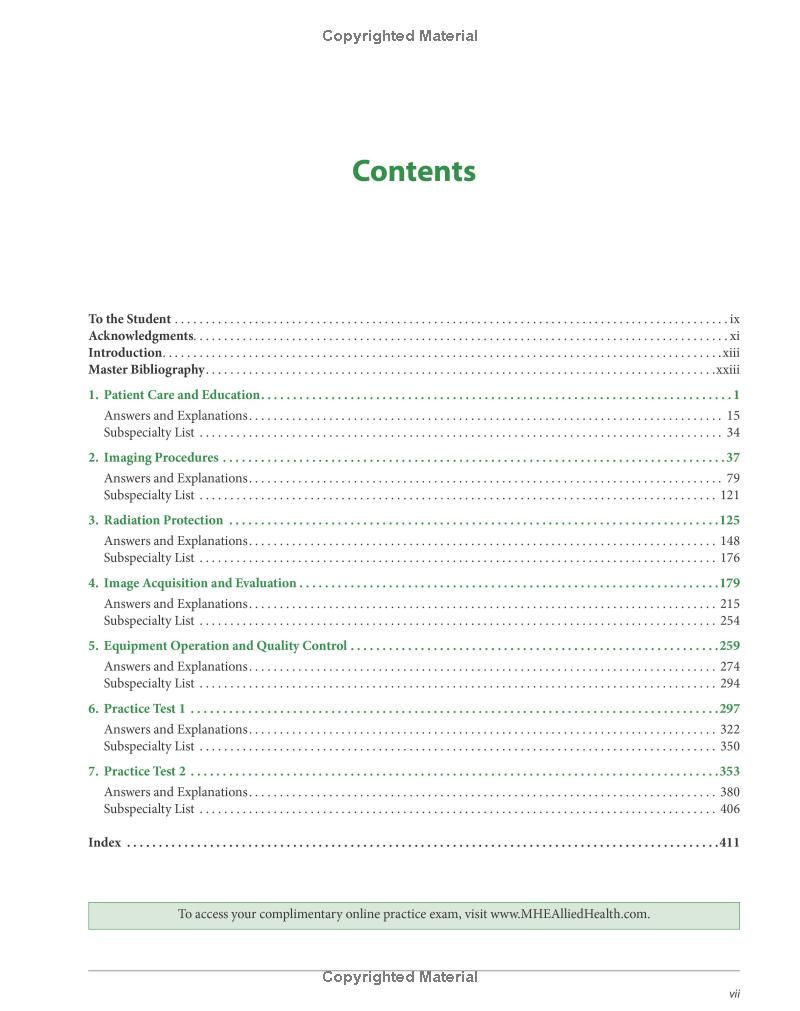 • Sections include Patient Care and Education, Imaging Procedures, Radiation Protection, Image Acquisition and Evaluation, and Equipment Operation and Quality Control