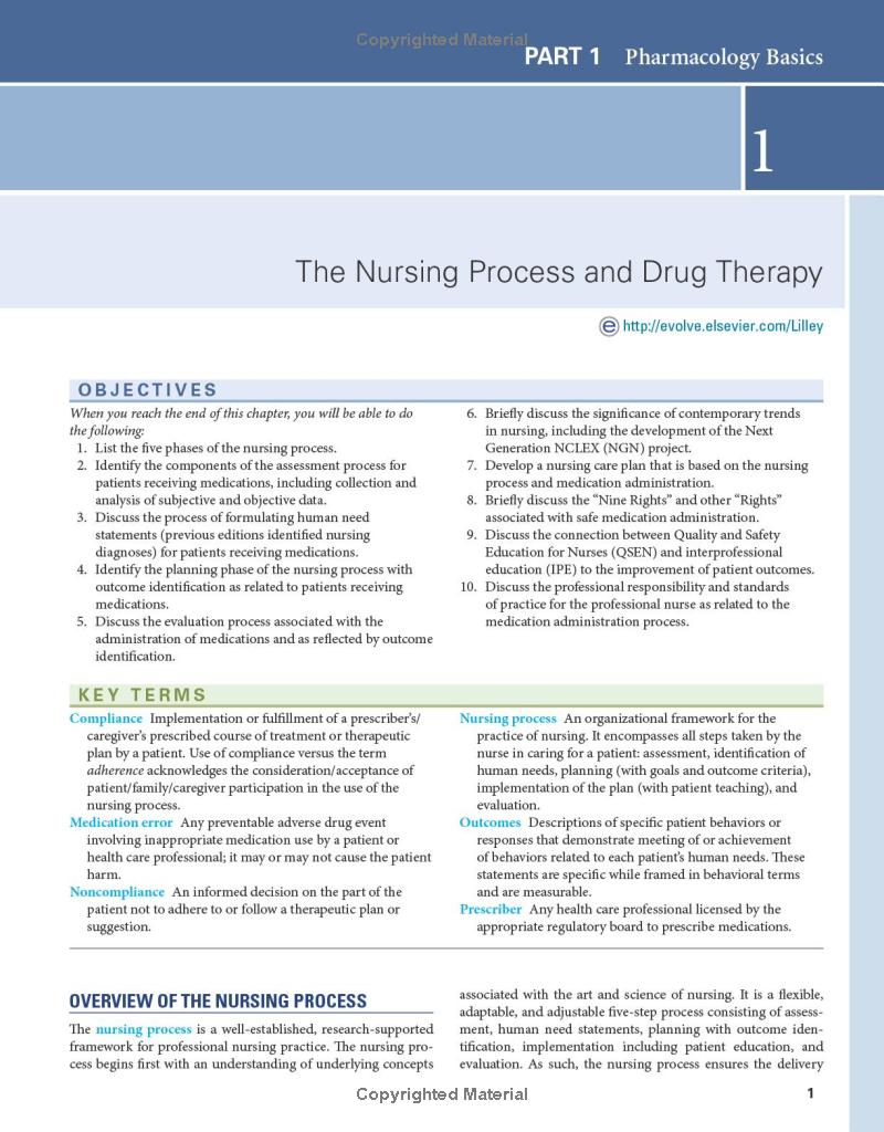 - The Nursing Process is applied to each category of drugs, ensuring that you administer medications accurately and safely, and includes the steps of assessment, human need statements, planning, implementation, and evaluation