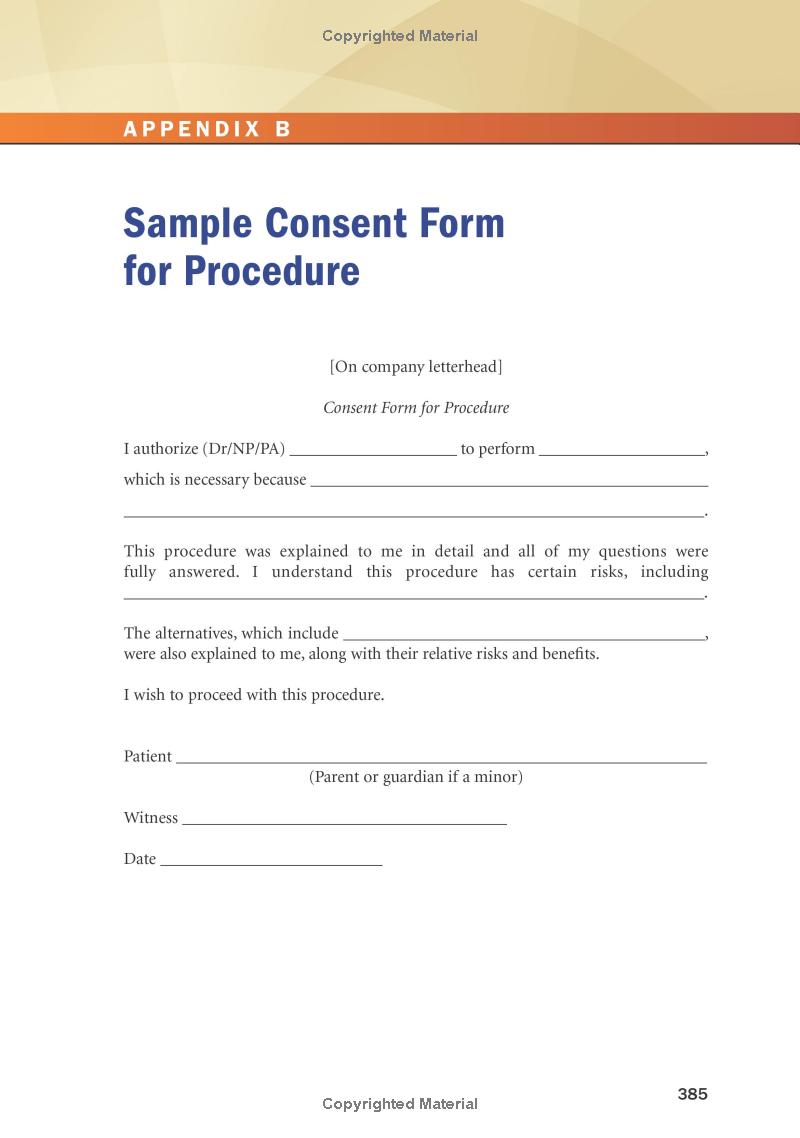 - Appendixes, including the Sample Checklist for Certification and the Sample Consent Form for Procedure, provide you with commonly used forms in an easy to access location.