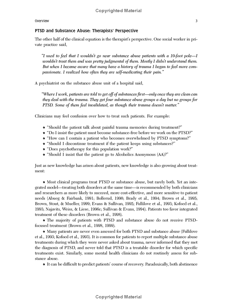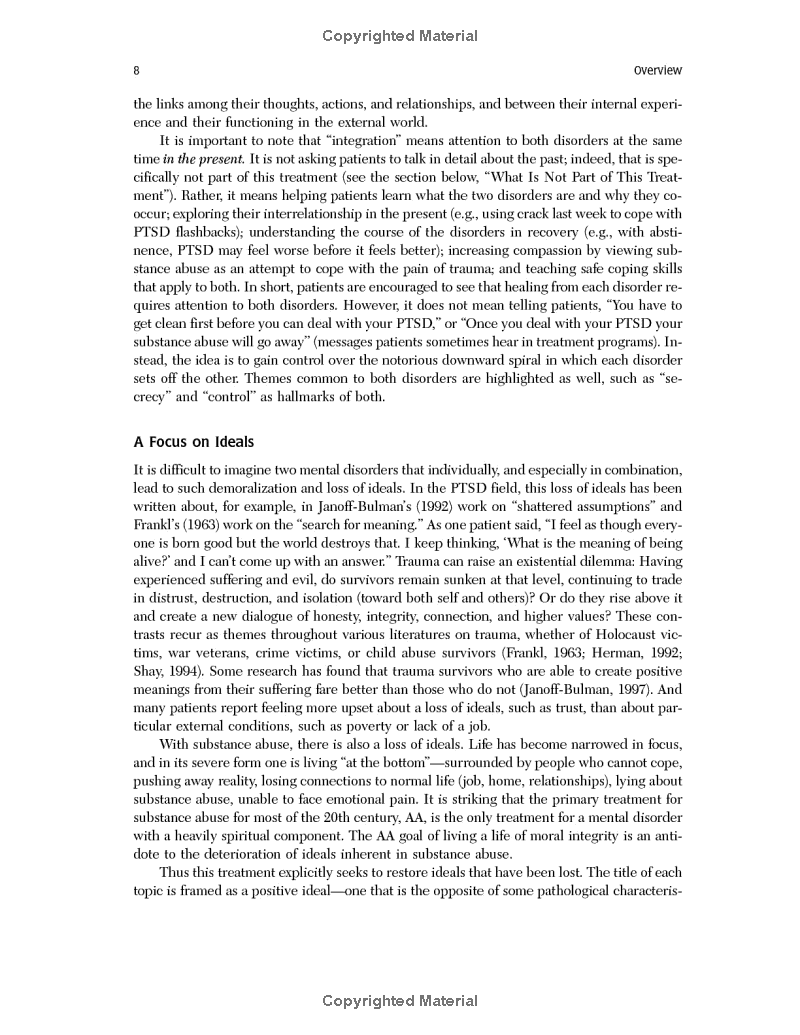 This manual presents the most widely adopted evidence-based treatment for co-occurring trauma and addiction. For clients facing one or both of these issues, the most urgent clinical need is to establish safety–to reduce addictive behavior, build healthy relationships, manage symptoms such as dissociation and self-harm, and restore ideals that have been lost.