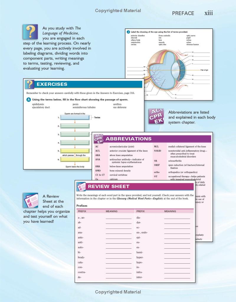 • Actual clinical procedures and lab tests are provided within the body system or medical specialty chapters to further demonstrate medical terminology in action.
