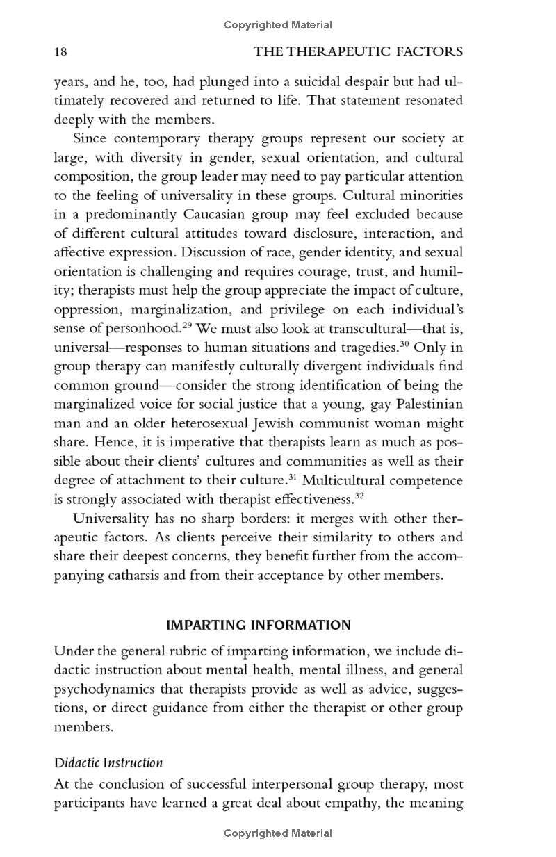 The Theory and Practice of Group Psychotherapy has been the standard text in the field for decades. In this completely updated sixth edition, Dr. Yalom and Dr. Leszcz draw on a decade of new research as well as their broad clinical wisdom and expertise. Each chapter is revised, reflecting the most recent developments in the field. There are new sections throughout, including online group therapy, modern analytic and relational approaches, interpersonal neurobiology, measurement-based care, culture and diversity, psychological trauma, and group therapy tailored for a range of clinical populations. At once scholarly and lively, this is the most up-to-date, incisive, and comprehensive text available on the practice of group psychotherapy.